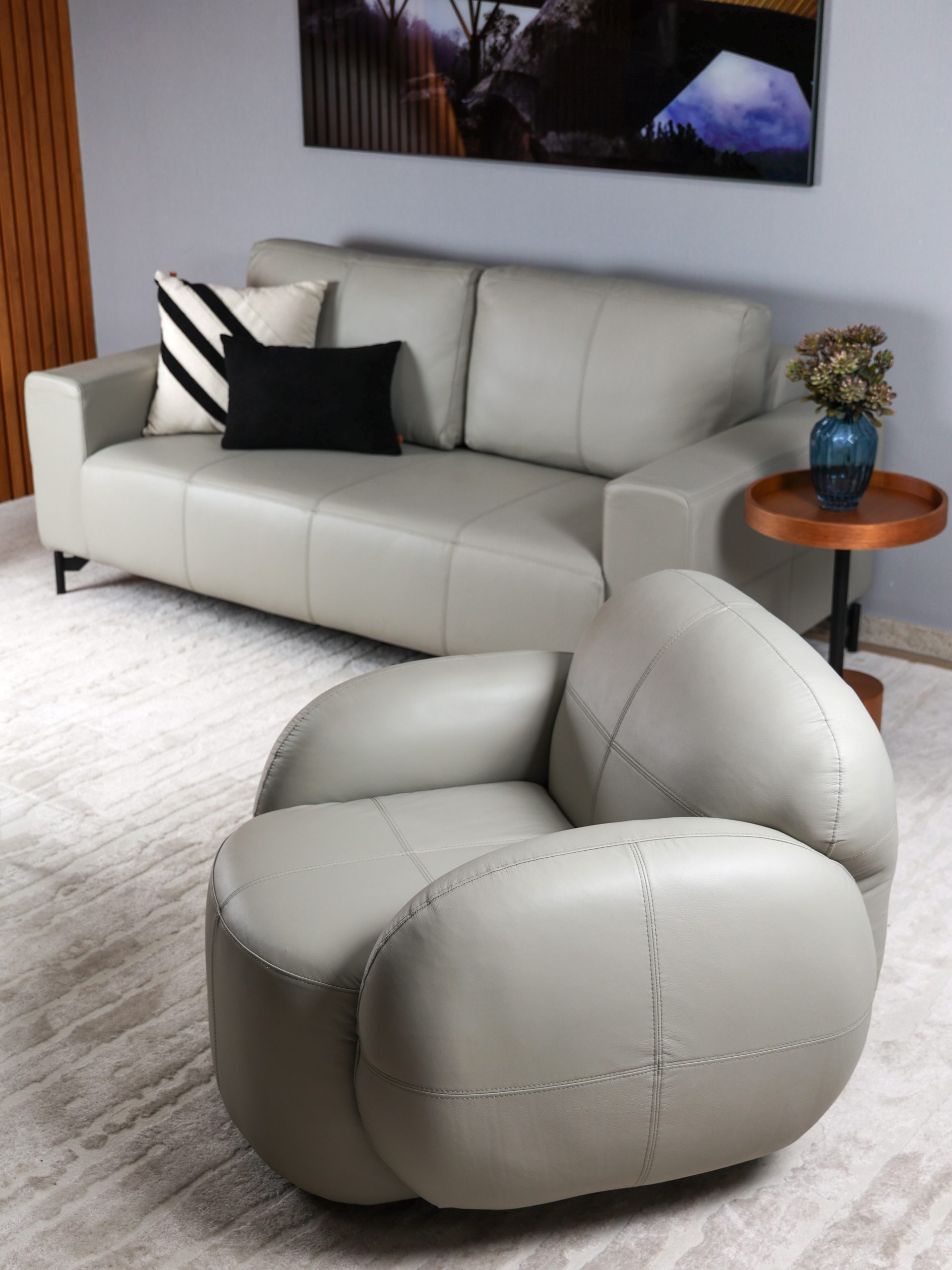 • Assento com recortes pespontados, espumas de 15cm de espessura e com molas pockets;